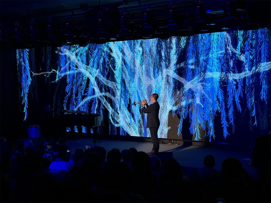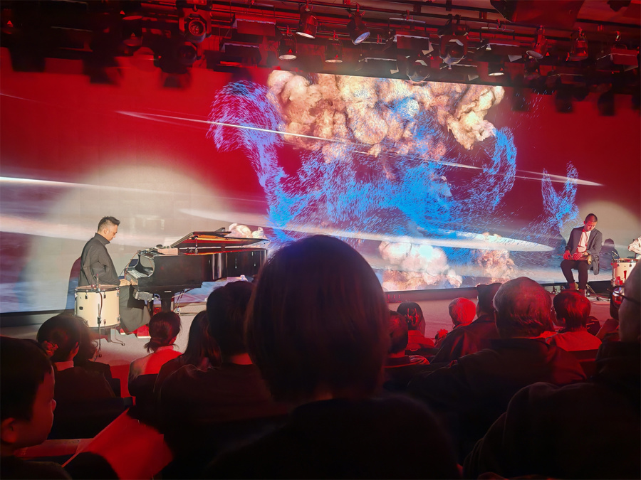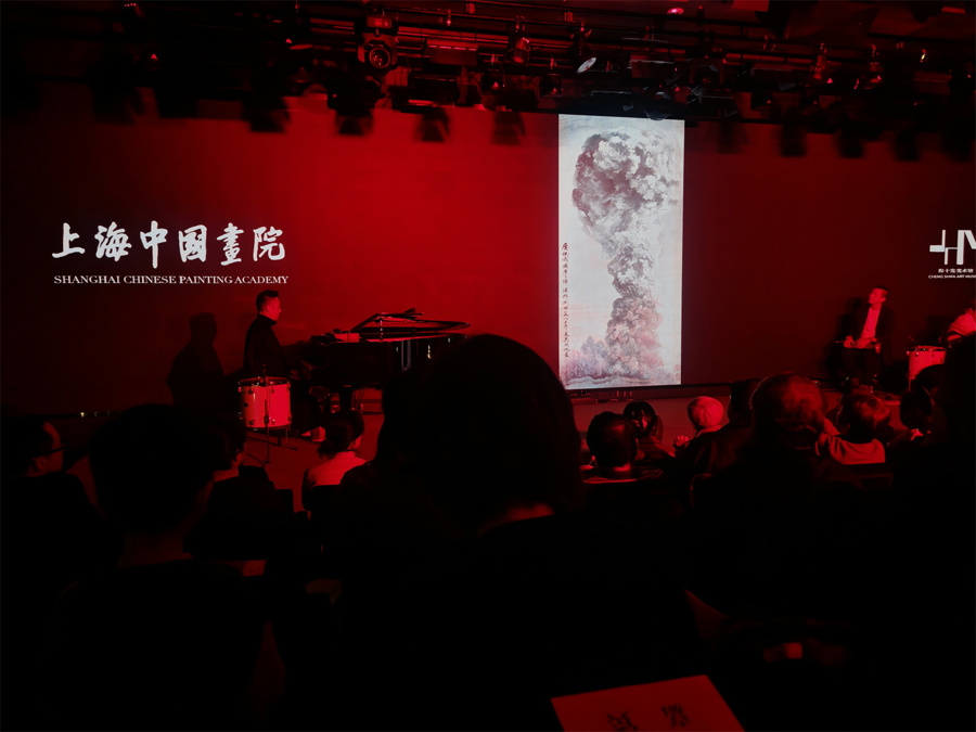 随着悠扬的旋律在美术馆流淌,程十发美术馆化身为沉浸式艺术空间。音乐会以“画面呈现+现场演奏”为核心形式,携手专业音乐人,围绕画师作品,将钢琴、小号、吉他、民乐与电子交响等多元音乐元素交织融合,配合震撼的视觉特效与数字技术,让静态的书画作品“活”了起来。