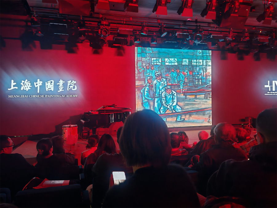 音乐会从丰子恺的《饮水思源》拉开序曲,到展现农业丰收图景的《披着露珠迎朝霞》《太湖丰收图》,再到记录工业建设热潮的《轧钢》《巨人站起来(万吨水压机)》,以及描绘城市发展的《上海港》《中国建造者》,上海中国画院画师的经典作品通过动态影像与数字特效逐一呈现。每一帧画面都与旋律精准呼应,每一段音符都穿梭于笔墨丹青之间,构建起声画交融、情景交融的艺术现场,邀请观众在流转的光影中沉浸式漫游海派绘画的艺术长河。