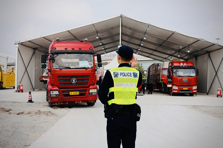 今年布展时间相较往年时间更短,因此布展车辆出行将更为集中。根据这一变化,警方在入场高峰时段将临时对诸陆西路(明珠路至华徐公路段)采取西向东单向交通管制措施,并增派巡逻力量加强明珠路沿线的疏导。同时,警方还与货运车辆运输承接负责单位建立工作联络机制,实时共享P26停车场饱和度、周边道路交通情况及整体安检进度等信息,便于驾驶员提前规划行程、错峰抵达安检区。而当P26远端安检区车流接近饱和时,警方将第一时间引导途中车辆转往P9停车场有序轮候,避免发生区域性交通拥堵。