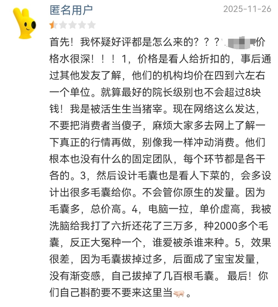在浏览各家医疗美容品牌的第三方平台评论区时,记者看到这样的一条低分评论:“价格是看人给折扣的,我被活生生当猪宰。”这条评论提到,他“被洗脑”,打了六折,以为三万多元的价格非常优惠,可事后了解到,他支付的费用远超该机构的实际成交均价。