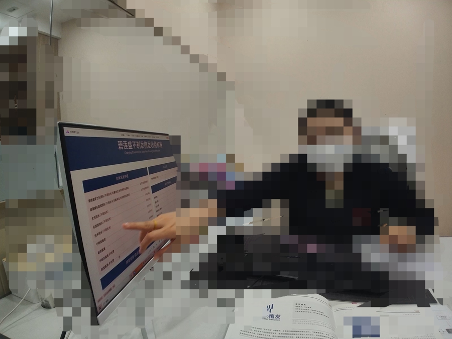 一名白大褂男医生在房间里,观察了记者的头发情况,并用尺子测量后,告诉记者,需要植发3500根左右。记者询问怎么收费,医生没有回答,领记者进来的女子补充,“我们这里不说价格,你有负责的介绍人吗?”医生跟着解释“我们这一般是熟人介绍来做的”。记者好奇问:“自己来做,做不了吗?”医生答:“也可以做,就是单价比较高。”