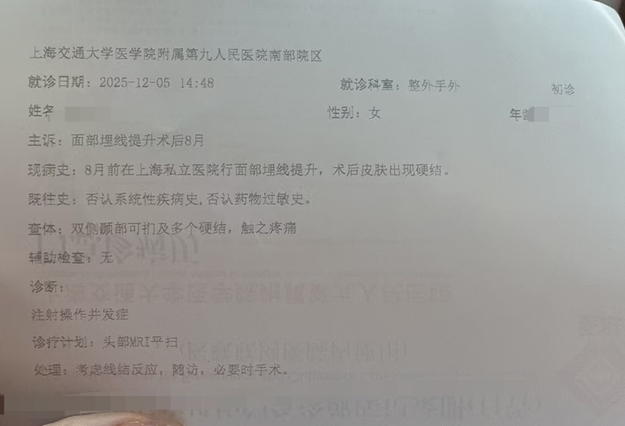 可她没想到,脸部项目做完一段时间后,太阳穴附近位置出现肿块,有不适感,半年来长期未消除。12月5日,一名助理带着郭女士到上海市第九人民医院做了检查,诊断为注射操作并发症,考虑为线结反应,必要时须手术解决。