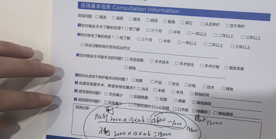 对无“熟人”介绍的记者,二人明显表现得不感兴趣。医生简单测量后便坐在一旁沙发上玩起了手机游戏,女子也忙着整理手里的单子,很少抬头搭理记者。记者不断追问,该机构的植发定价标准究竟是什么,两人均称不知道。最后,医生又拨打电话给楼下前台工作人员询问,前台先是说5元每根,随后又改口10元。最终,3500根头发移植,记者收到了35000元的报价。