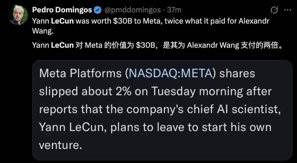 威斯康星大学计算机科学教授Pedro Domingos发文称,杨立昆对Meta的价值为300亿美元(折合人民币约2100亿元),是(扎克伯格)为亚历山大·王支付的2倍。杨立昆离职消息被曝后,Meta股价应声下跌2%。