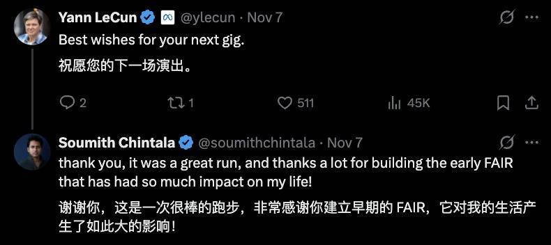 就在几天前,PyTorch之父Soumith Chintala发布长文宣布自己将于11月17日正式离开Meta,他在Meta工作11年,领导PyTorch团队近八年。当时杨立昆还发表了评论“祝你下一次工作顺利”。